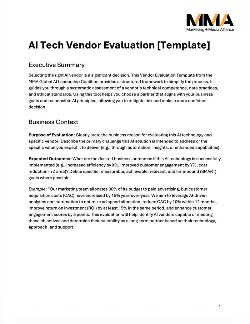 As AI capabilities expand and the vendor landscape grows more complex, marketers need a rigorous, repeatable process for evaluating potential technology partners. Developed by MMA Global’s AI Leadership Think Tank — the largest working group of senior marketers focused on responsibly applying AI in marketing, with members from more than 160 brands — this template distills collective expertise into a practical, ready-to-use evaluation framework.